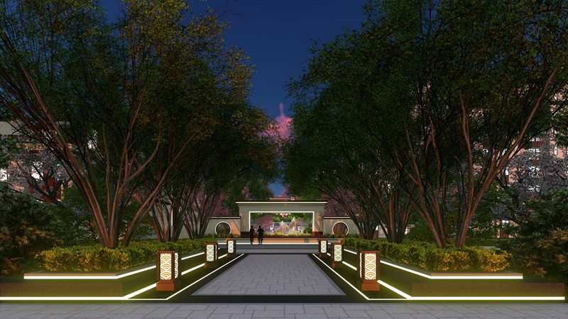 園區(qū)道路采用人車分流的設計方式,避免大量私家車對居住環(huán)境的影響,保證小區(qū)的安全與安靜。設計結合單元入口、車庫位置及各功能分區(qū),遵循新中式景觀特點,圍合出院落空間。